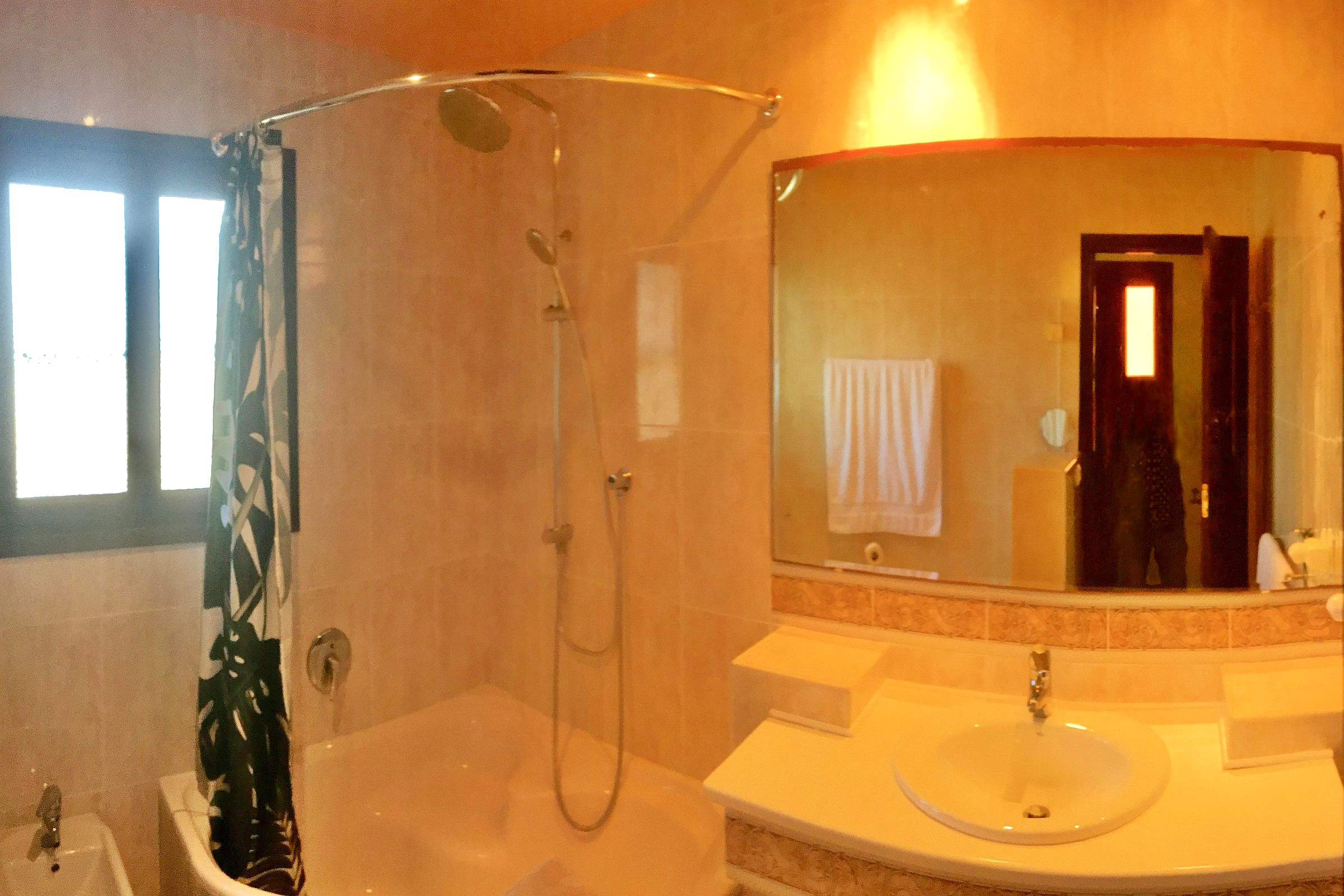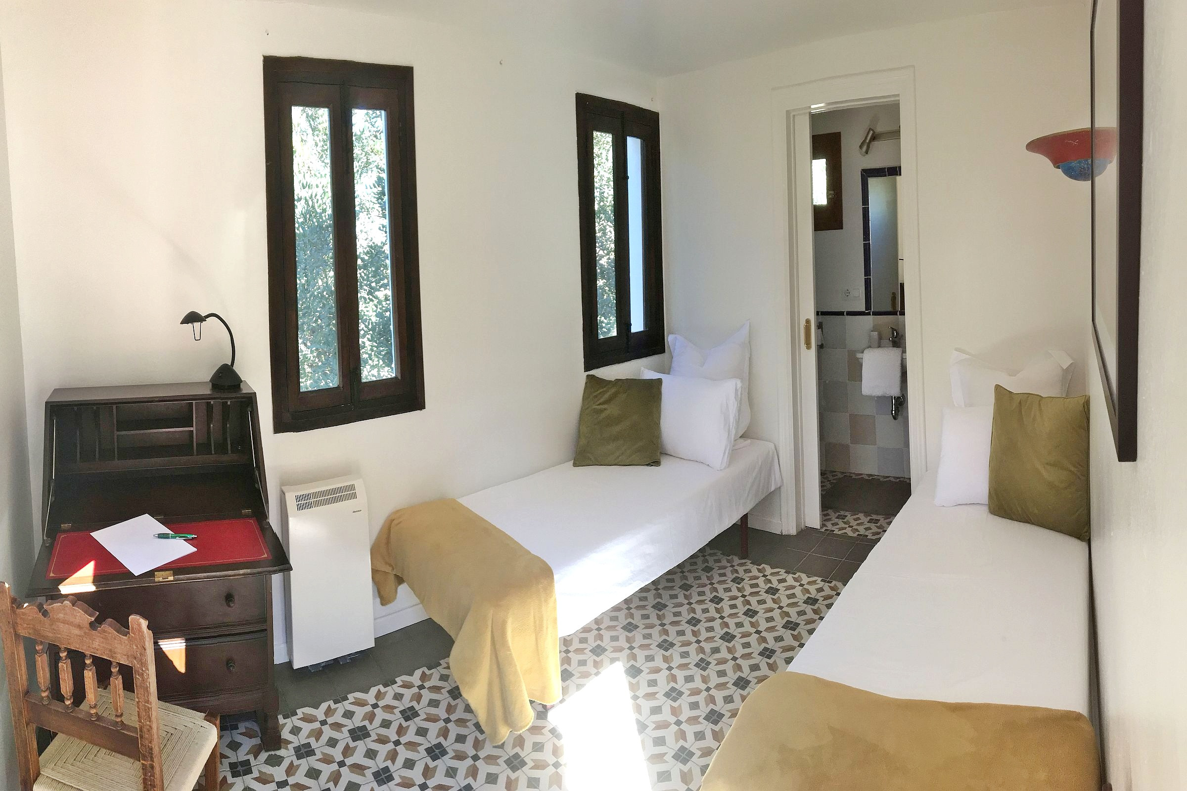 Si vous allez de la piscine à la petite tour avec terrasse ensoleillée, vous trouve à mi-chemin la quatrième chambre avec deux petits lits (80x190) et une petite salle de douche privative.